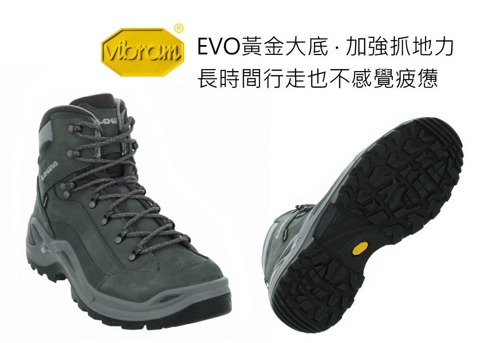 使用Vibram® EVO黃金大底,加強抓地力,給予行走間最佳的抓地力與穩定性,並提供了一定的緩衝,適合於多種環境中使用,長時間行走也不感覺疲憊。