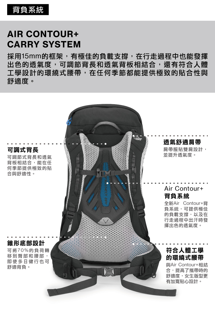 採用Air Contour+背負系統,在通過陡峭地形時可舒適地快速移動,並結合高效的載重和出色的舒適性,加上多功能空間設計可應付多種路線,適合中長距離的登山健行。