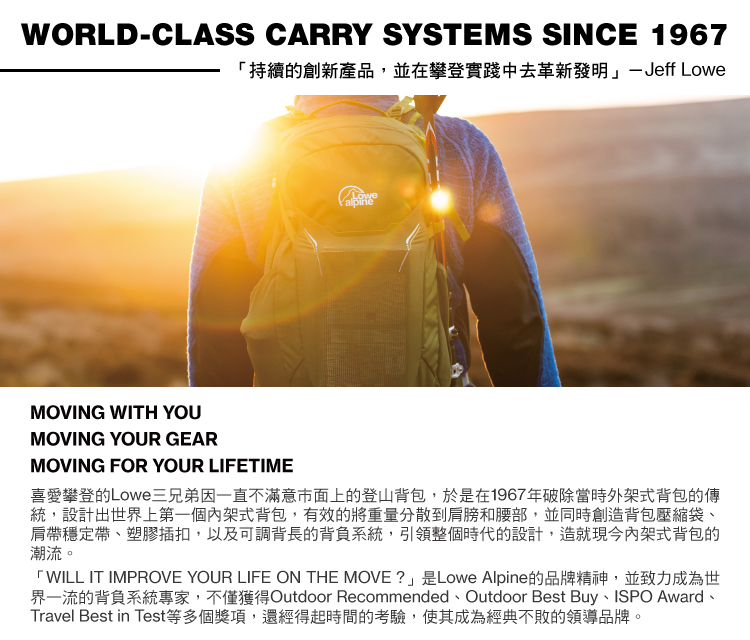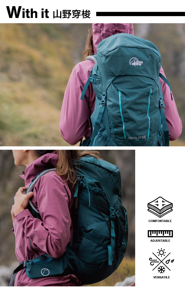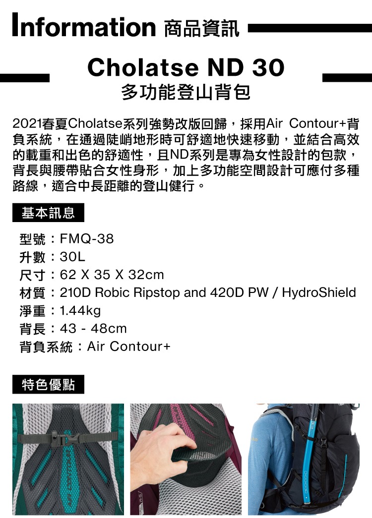 採用Air Contour+背負系統,在通過陡峭地形時可舒適地快速移動,並結合高效的載重和出色的舒適性,加上多功能空間設計可應付多種路線,適合中長距離的登山健行。