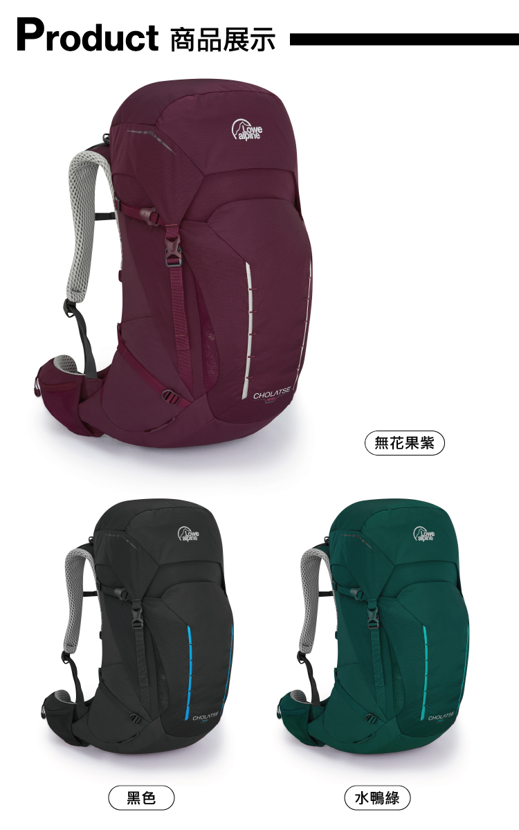 採用Air Contour+背負系統,在通過陡峭地形時可舒適地快速移動,並結合高效的載重和出色的舒適性,加上多功能空間設計可應付多種路線,適合中長距離的登山健行。