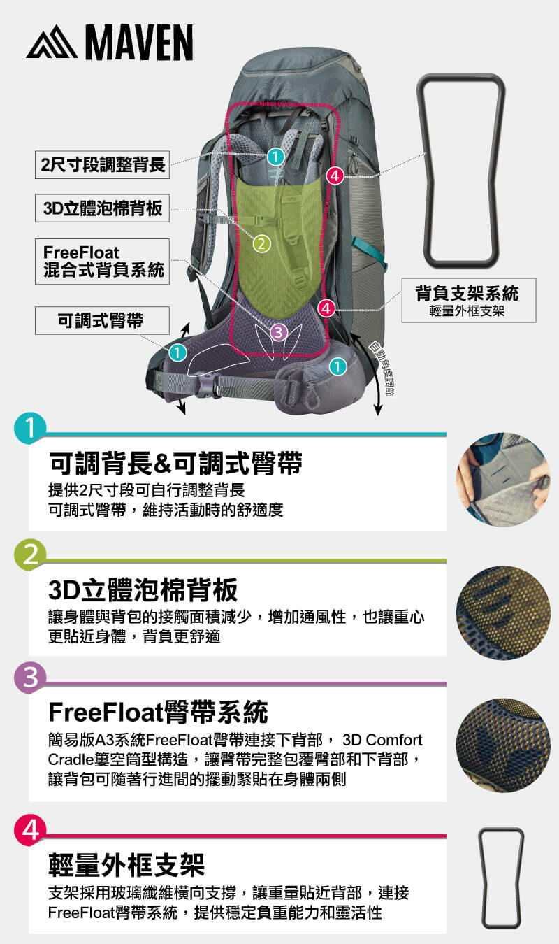 當需要逃跑時,Maven 45 可以短距離到達遙遠的露營地。方便的側 U 型拉鍊讓您井井有條,可調節的動態 FreeFloat 懸吊提供透氣、客製化的貼合感。
