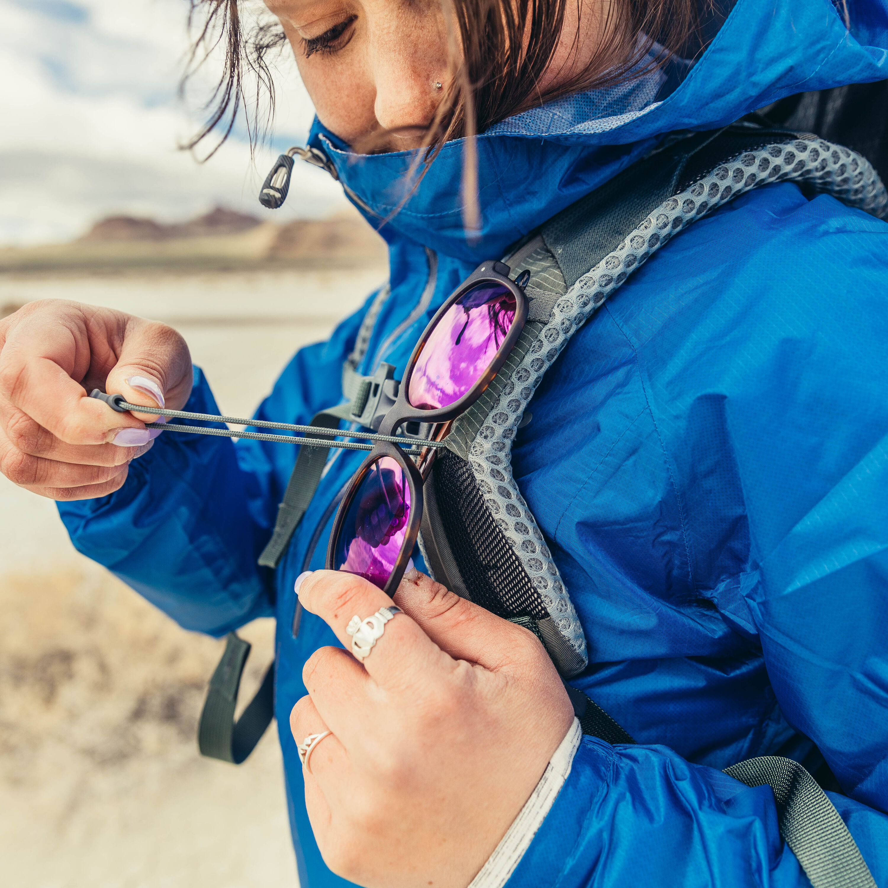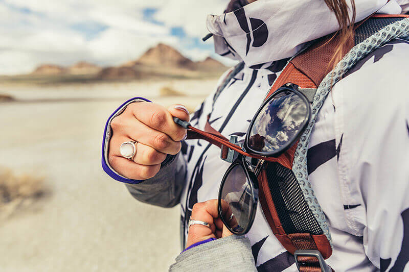 肩帶上的 Quickstow 系統可安全、防刮地存放您的太陽眼鏡。