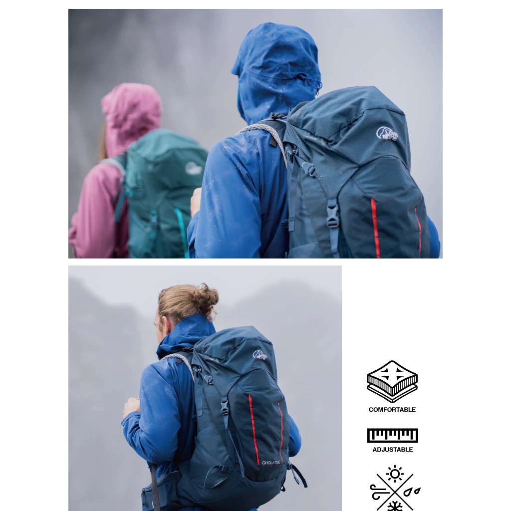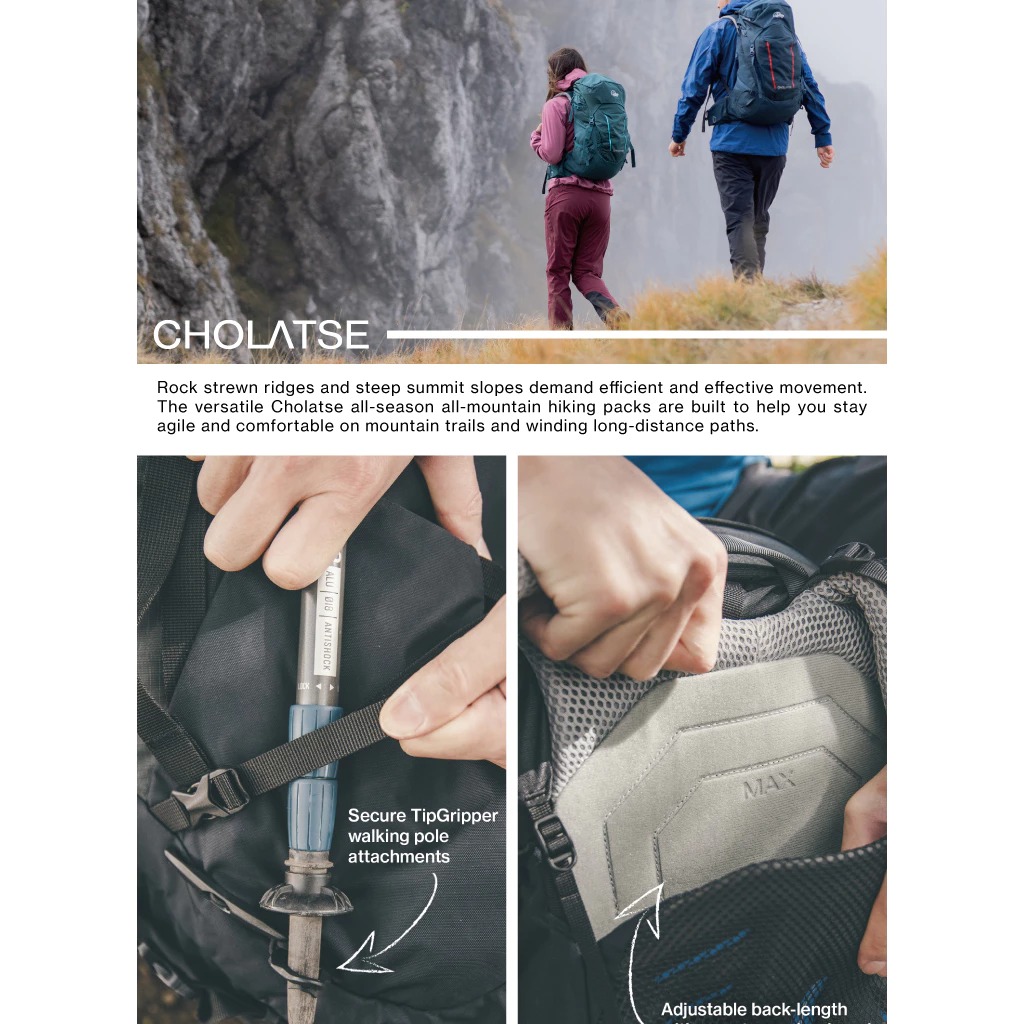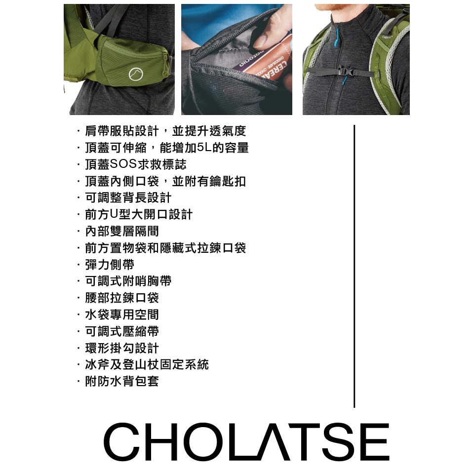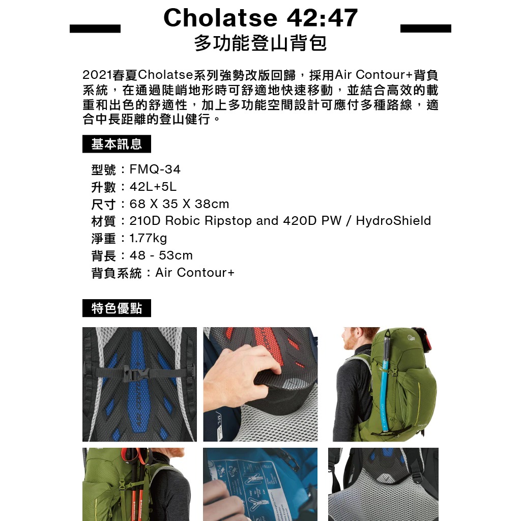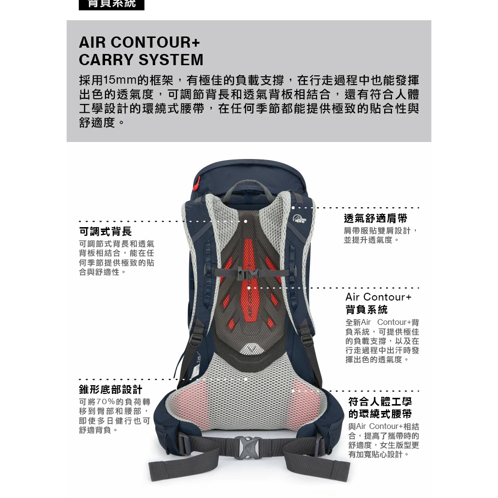 採用Air Contour+背負系統,在通過陡峭地形時可舒適地快速移動,並結合高效的載重和出色的舒適性,加上多功能空間設計可應付多種路線,適合中長距離的登山健行。