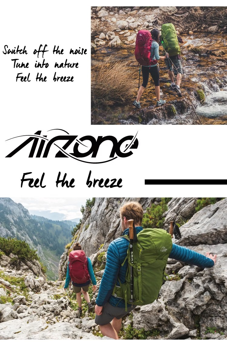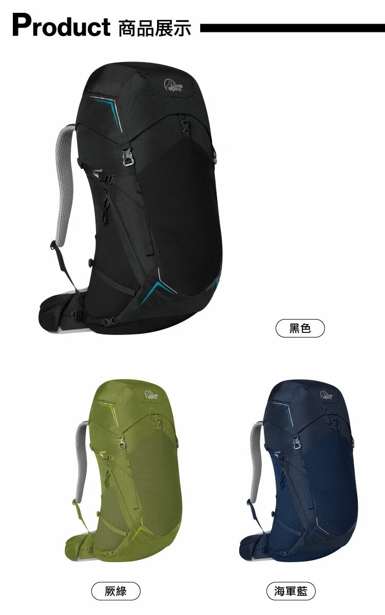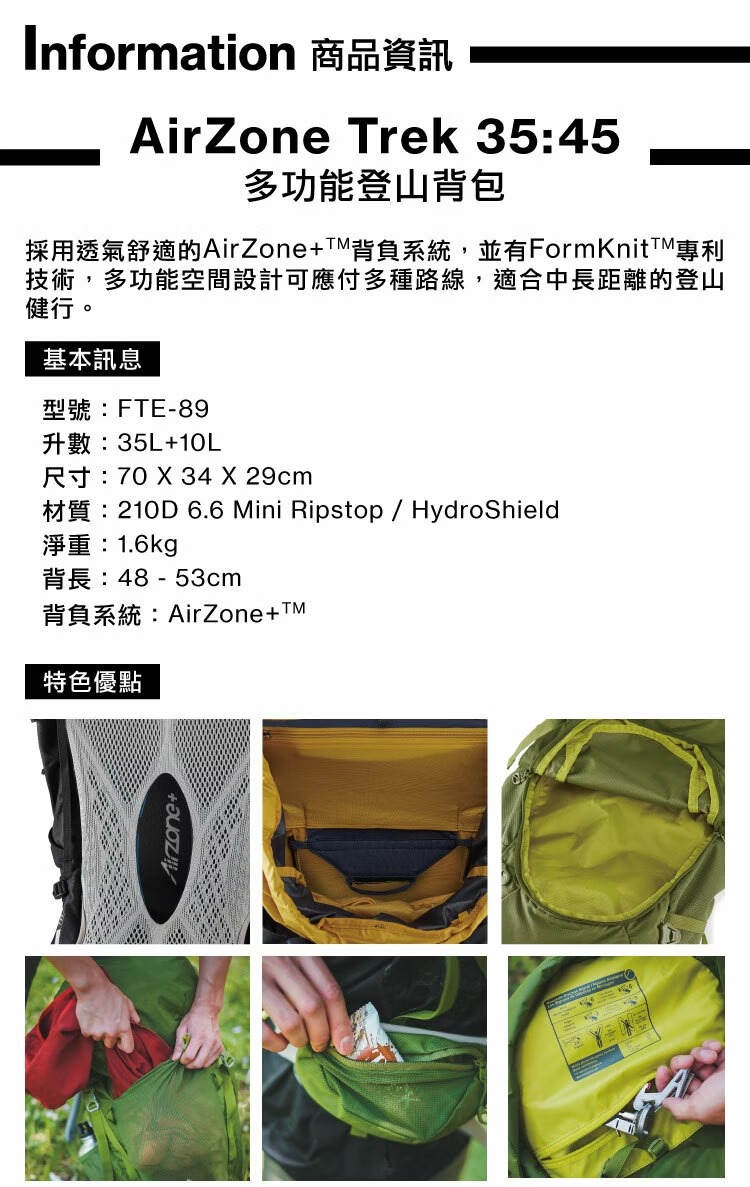採用透氣舒適的AirZone+TM背負系統,並有FormKnitTM專利技術,多功能空間設計可應付多種路線,適合中長距離的登山健行。