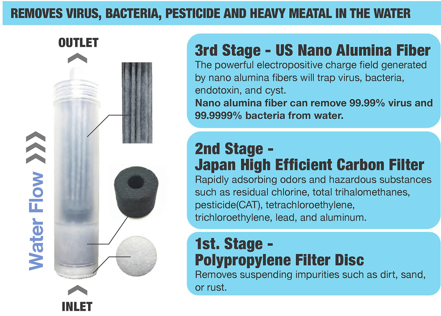 Inside the filter cartridge, the polypropylene filter disc removes dirt and dust in water. The combination of alumina fiber and activated carbon fiber removes 99.92% viruses, 99.99994% bacteria, endotoxin, cysts, parasites, mircoplastics, dirt, odor, organic pollutants, and chlorine.