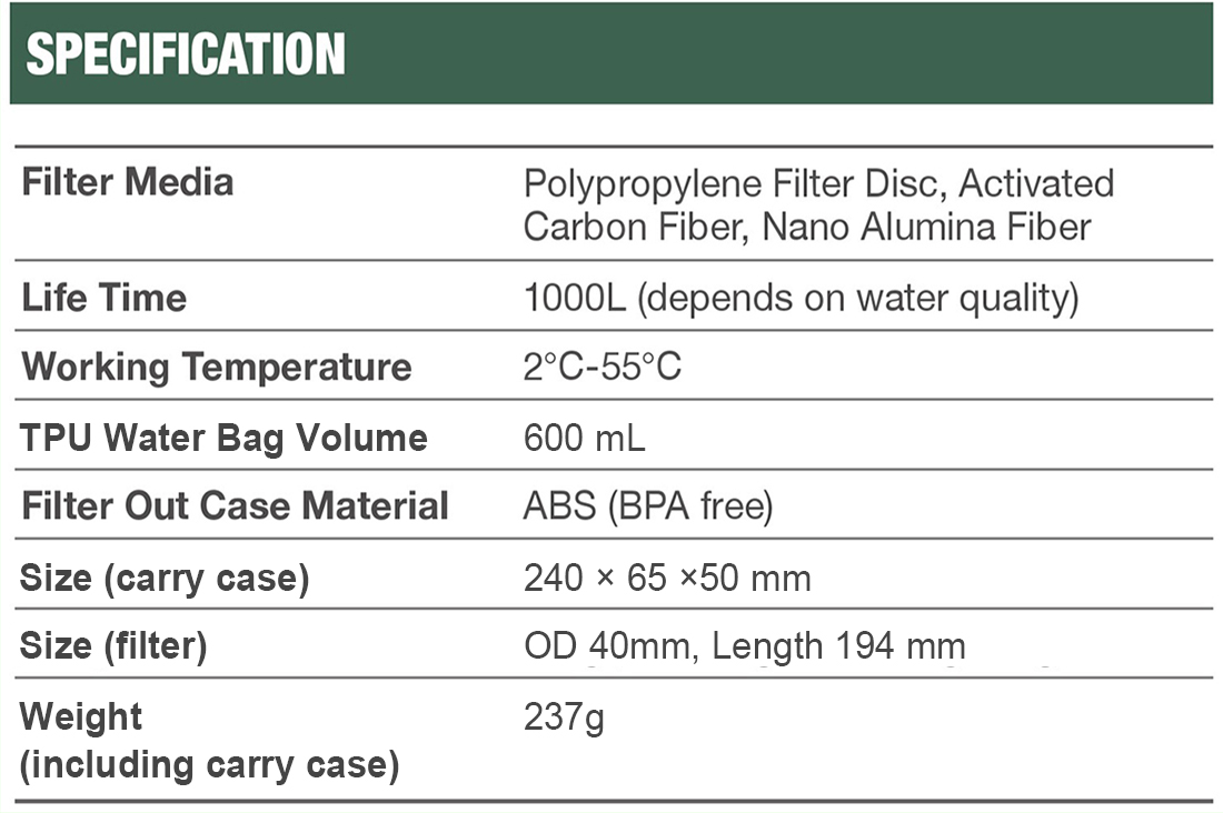 - Turns lake water or stream water into directly drinkable water after filtration.