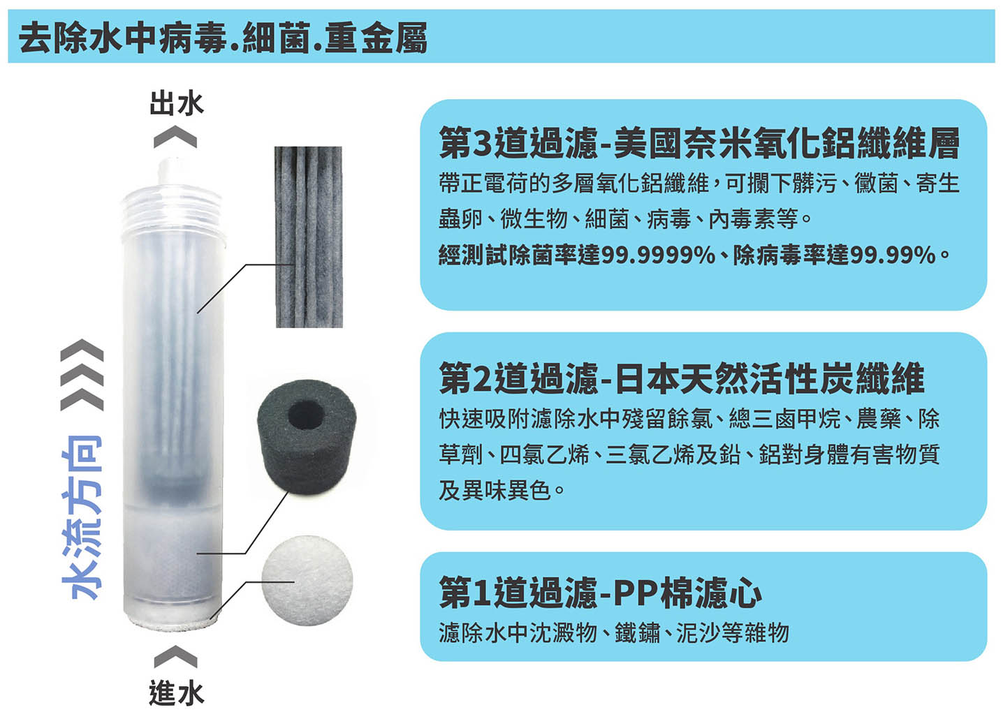- 去除水中病毒、細菌、胞囊、寄生蟲、泥沙、異味、水中餘氯及多種有機污染物
