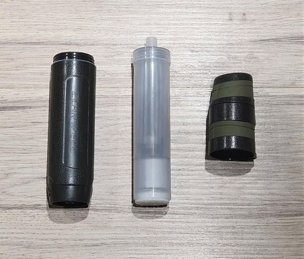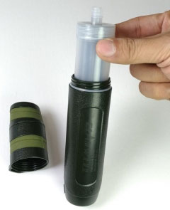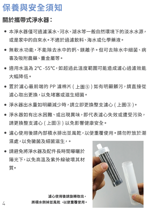 1.) 使用時用口吸取溪水透過戶外淨水器過濾後,可以直接生飲,或將濾水器旋轉接上裝了溪水的寶特瓶,擠壓過濾亦可直接生飲,濾心材料為美國奈米氧化鋁纖維層+日本炭纖維濾心,去除水中細菌病毒,濾心更換容易20秒可完成,SGS除菌報告99.9%。