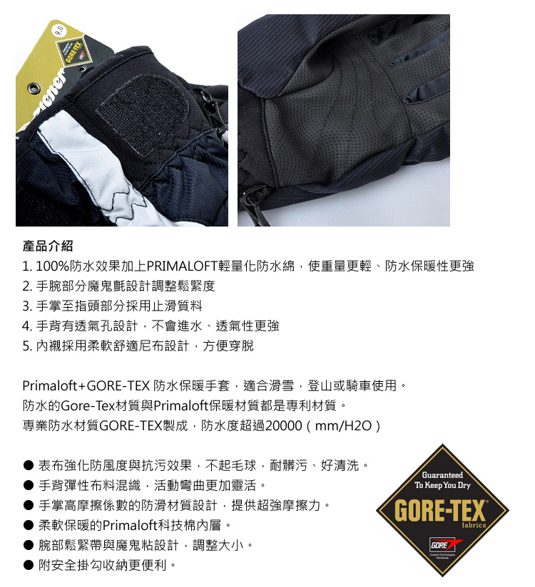 Primaloft+GORE-TEX 防水保暖手套,適合滑雪,登山或騎車使用。