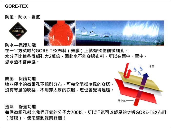 防水的Gore-Tex材質與Primaloft保暖材質都是專利材質。