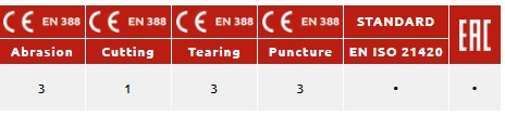 經 CE EN 388 機械風險認證(防護等級:磨損 4 級、切割 1 級、撕裂 3 級、穿孔 3 級)。
