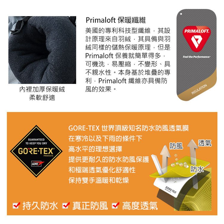 Primaloft Gold 黃金標+ GORE-TEX(防水超高特級28,000mm /24H)