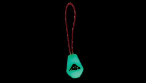 夜光型拉鍊頭,白天放在陽光下,晚上可持續發亮長達 8 小時,方便在夜晚尋找帳篷或裝備位置。