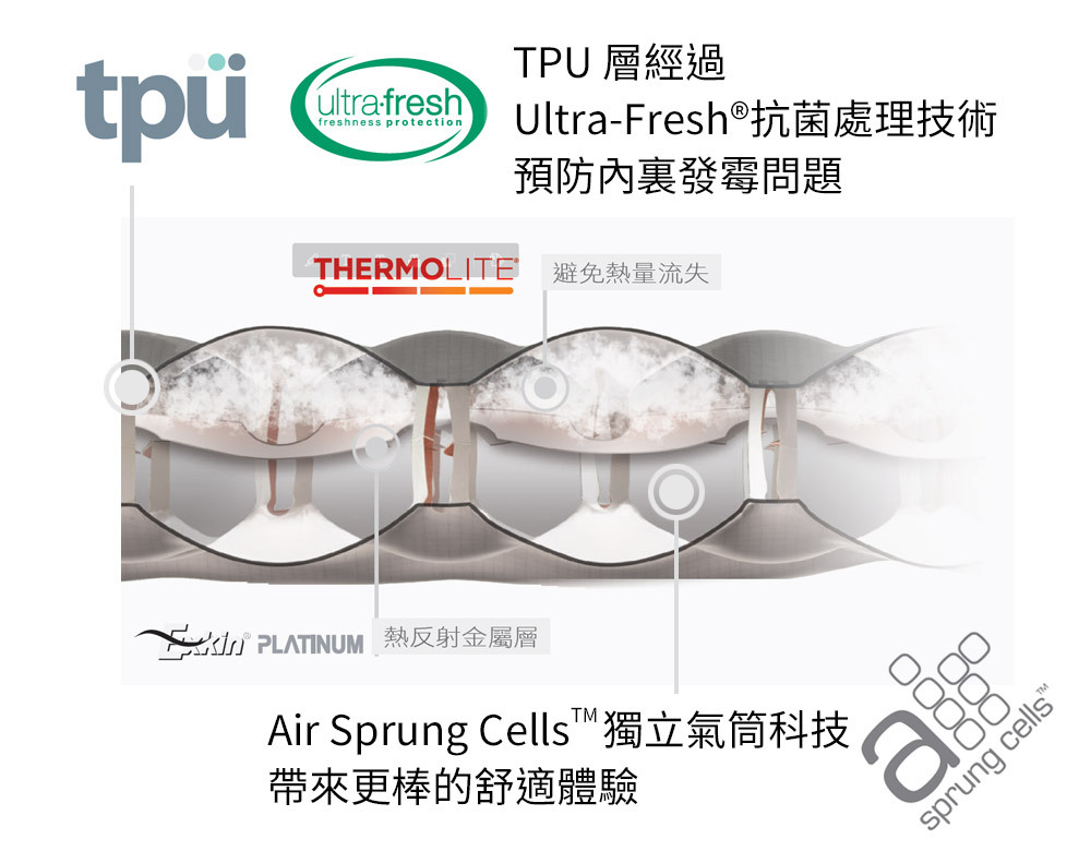 - Air Sprung Cells ™ 較厚的獨立氣筒與隔離層