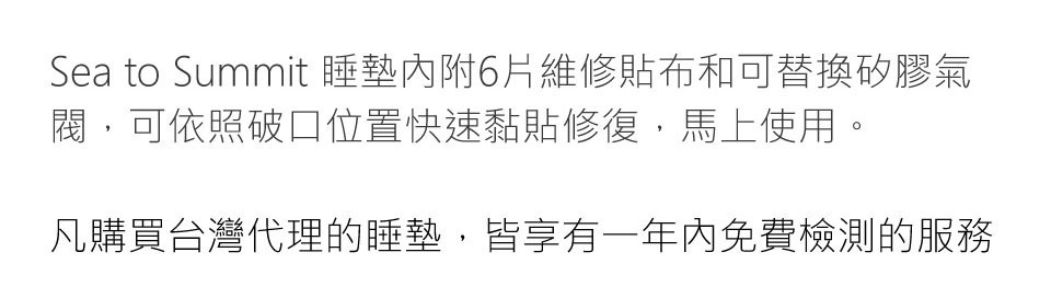 來自澳洲最佳戶外裝備 Sea to Summit,追求更輕量、更耐用、更符合戶外活動的需求,帶給您戶外活動最棒的睡眠品質。Sea to Summit 致力於研發出一款優於市面上現有睡墊更棒的款式,這樣的企圖心驅使 Sea to Summit 成功研發出世界上即為輕巧、方便攜帶的全系列睡墊新品!探究為什麼 Sea to Summit 能設計出如此切合戶外活動中所需要的產品,只因為在乎每次在戶外過夜的睡眠品質。Sea to Summit 非常榮幸能帶給戶外活動喜愛者如此卓越的商品,助您一夜好眠!