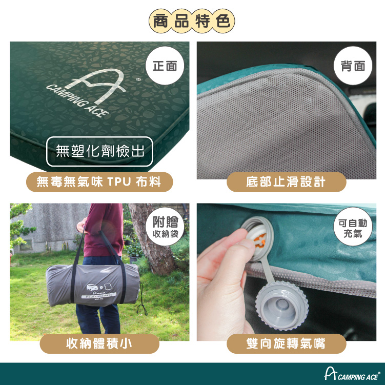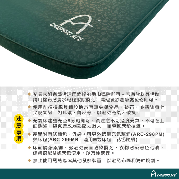 4. 產品附有修補包、外袋。可另外選購充氣幫浦(ARC-298PM)與床包(ARC-299MB,適用M號床包,花色隨機)