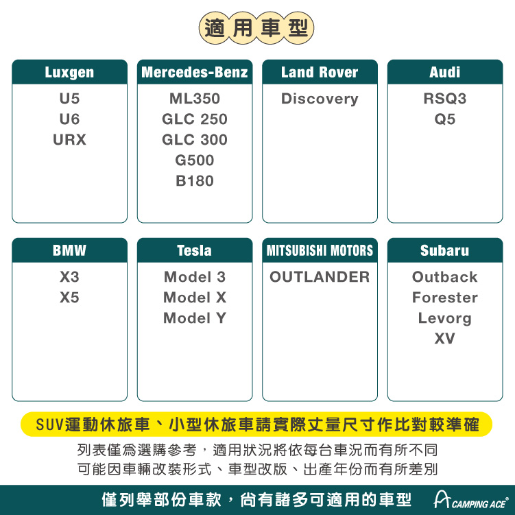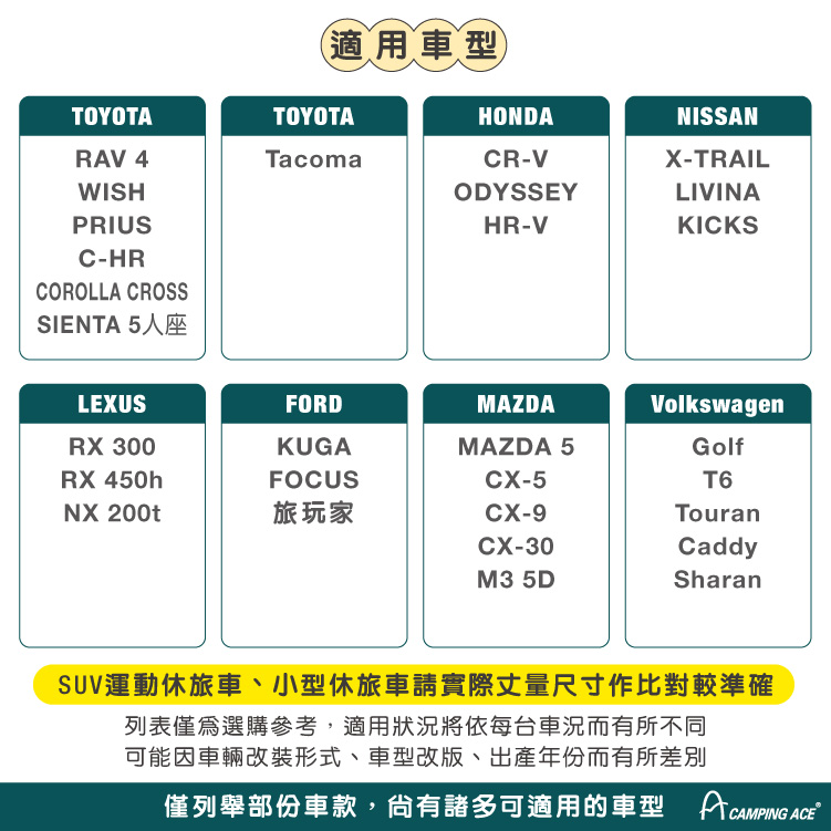 (列表僅為選購參考,適用狀況將依每台車況而有所不同,可能因車輛改裝形式、車型改版、出產年份而有所差別)