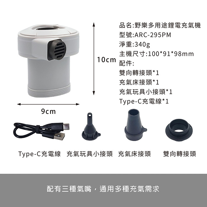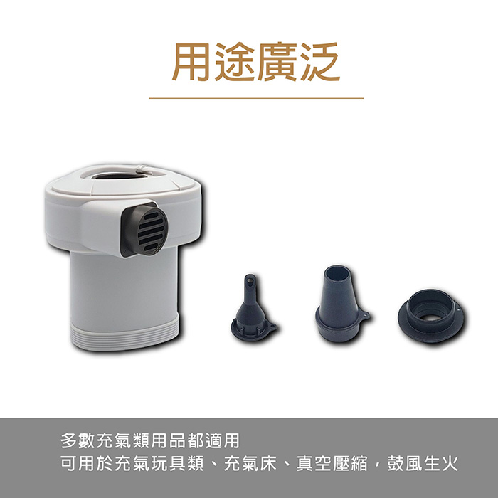 - 配件: 雙向轉接頭*1 充氣床接頭*1 充氣玩具小接頭*1 Type-C充電線*1