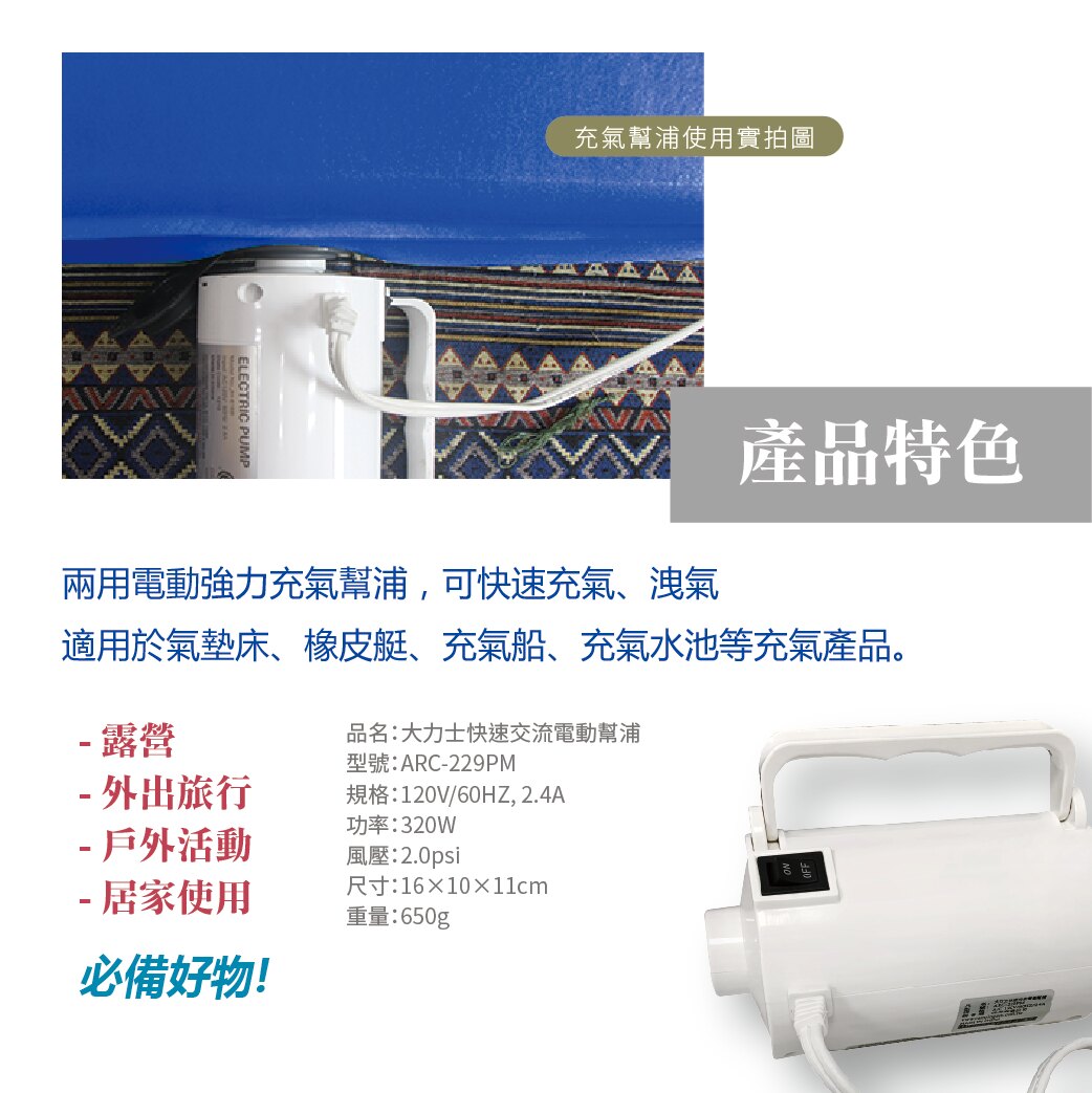 - 適用於氣墊床、橡皮艇、充氣船、充氣水池等充氣產品。