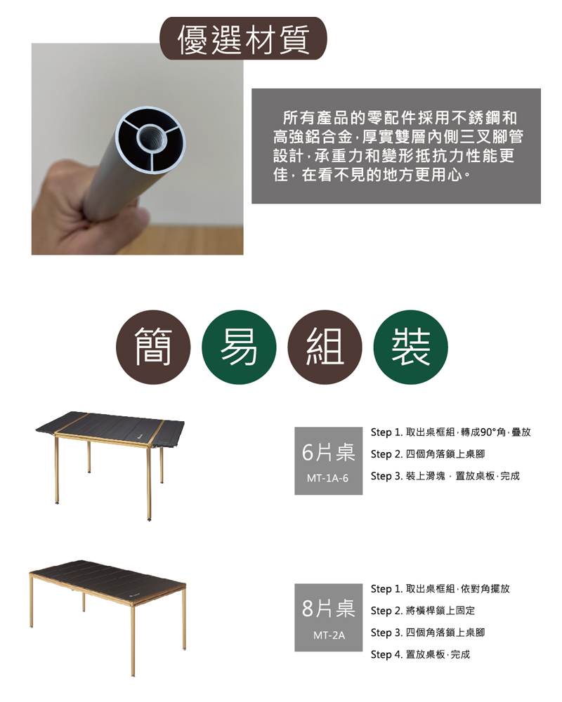 MT-1A-6 6 鋁合金 桌板*4、桌框組*1、腳柱*4、三角滑塊*4 80.5X50.5X45 56X13X13 3.4 4100