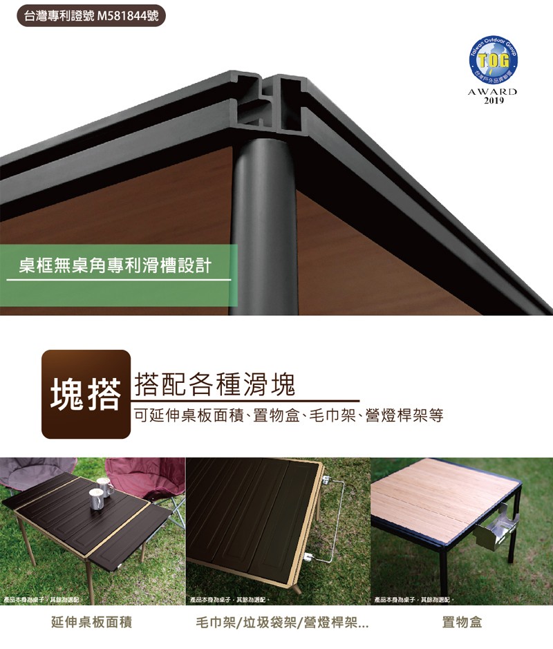 『Morixon 塊搭多功能系統桌』具有桌面四邊有延伸功能和系統化設計,可藉由戶外休閒活動中來陸續添購需要的塊搭桌配件,不僅僅只是一張休閒桌,而是一個具有外擴性的系統化產品。無桌角滑槽的專利設計,四邊都可做多方面應用,可搭配各種滑塊,延伸桌板面積、如營燈桿架、毛巾架、置物架等等,桌板多樣化設計更能依照不同用途搭配不同的桌板材質,在使用上以藉由不斷延伸組裝的概念,將桌子賦與多重用途,可搭配不同模組件,擴展使用便利性,輕便、多樣化性能滿足戶外活動者需求,打造舒適便利的休憩空間。