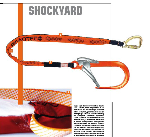 SHOCKYARD 全長上皆有減震運作。若發生事故,下墜能量會被很好控制在6kN以下,平衡減震,不會有負荷峰值轉換為SHOCKYARD的下墜減震繩器的塑性變形。