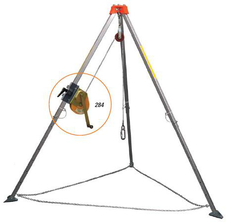 用一個三角架(Tripod, EN795認證)作為固定點,具備鋼索捲揚器(EN1496認證),以備工人在發生意外時可以快速的將他救上地面。