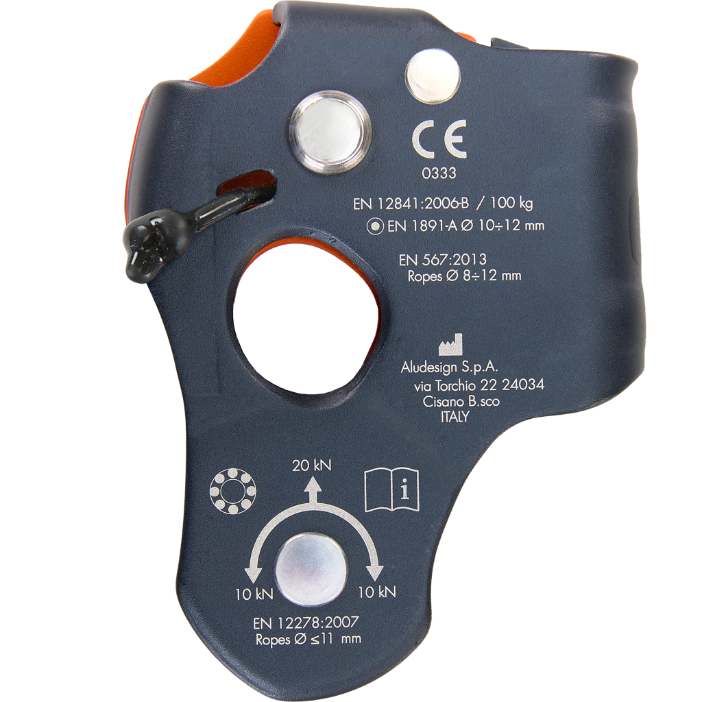 .整合式滾珠軸承滑輪可用作簡單的重定向,以便更輕鬆地上升繩索或提升人員,而無需額外連接器的幫助(繩索夾/滑輪模式);