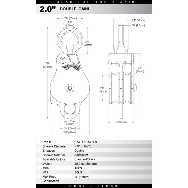 將萬向轉軸與滑輪結合在一起,傳統上需要透過一個鉤環連接,Omni不用,減少了鉤環的空間,更易於極限空間操作。重量更輕,攜帶更輕鬆。側開版的特殊設計,可以不拆卸滑輪即打開側板裝入繩索,傳統則需要將鉤環拆卸下來。