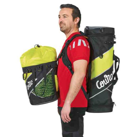 簡易的繩袋,36公升的容量,約可存放60米的主繩。袋口為束口繩設計,可以調整開口大小,也可完全向外反摺打開。
