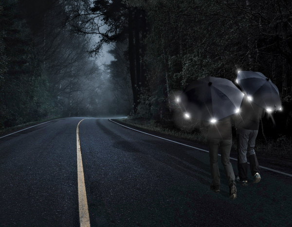 在傘骨邊緣增加三角反光圖示,在夜晚能見度提高,讓使用者更安全。