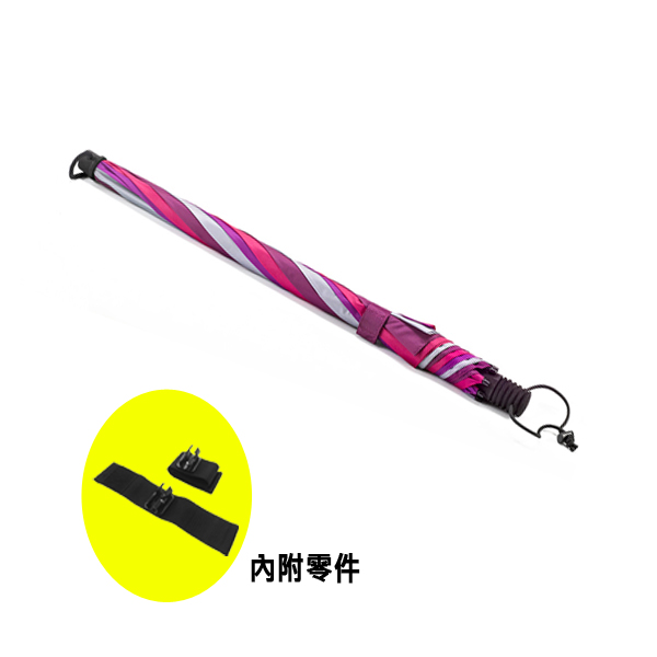 這把特別的雨傘強調它的伸縮玻璃纖維柄,可變化延伸到超過1公尺長度,利用一個小扭轉動作即可固定在任何高度。藉由兩個隨附的扣具去固定背包上的2個帶子,根據風和雨的方向可固定在右邊、左邊。雨傘握把的彈性環可彈性固定在腰帶上。