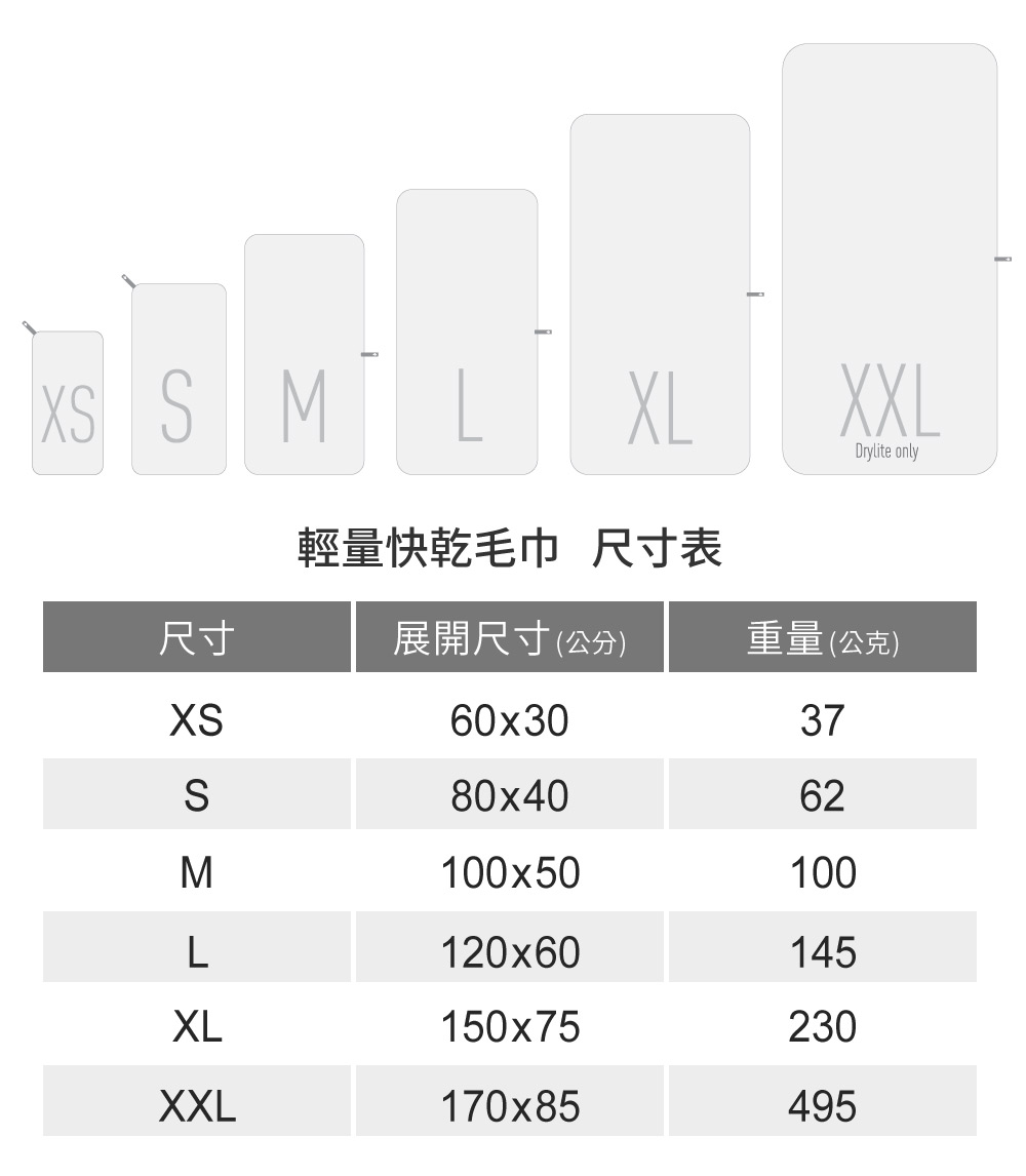 • 方便收納,所有的毛巾都搭配了收納袋或EVA盒子,比舒適快乾毛巾體積更小。