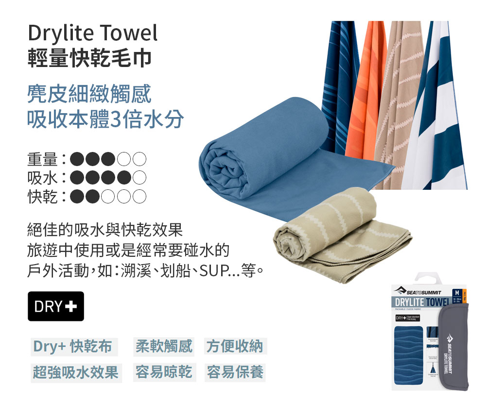 麂皮觸感的超細纖維毛巾,吸水力強,吊環網袋兼具,方便使用與攜帶,旅遊中使用或是經常要碰水的戶外活動,如:溯溪、划船、SUP...等。