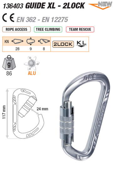 The Guide XL carabiner with an automatic twist lock closure. The Guide XL is an oversized version of our popular Guide carabiner with a unique shape that gives it an excellent strength-to-weight ratio and a huge gate opening for easy handling with ropes and rigging. An excellent choice for anchors and rigging.