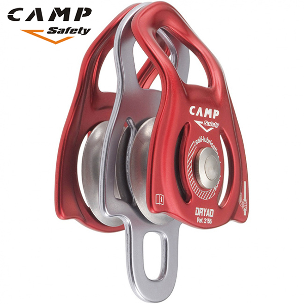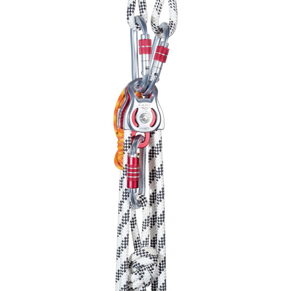 Compact double pulley for block-and-tackle systems. Large connection hole accomodates two carabiners. For ropes up to 13 mm. Prusik minding, the self-locking knot can be installed on both sides and both wheels. Self-lubricated brass bushings are the perfect solution for light applications at low speed. Efficiency: 80%. Aluminum alloy body and wheels, stainless steel axle.