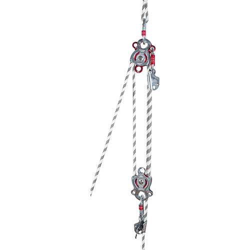 A high strength multifunctional double pulley for block-and-tackle systems and complex operations. Features large wheels, a main attachment point that accommodates three carabiners, and a large becket with a large bottom attachment point and two secondary attachment points on the sides for linking, positioning and attaching progress capture systems. For use with ropes up to 16 mm. Prusik minding, the self-locking knot can be installed on both sides of both wheels. Sealed ball bearings for high efficiency and intensive use at high speed. Efficiency: 97%. Aluminum alloy body and wheels, stainless steel axle.