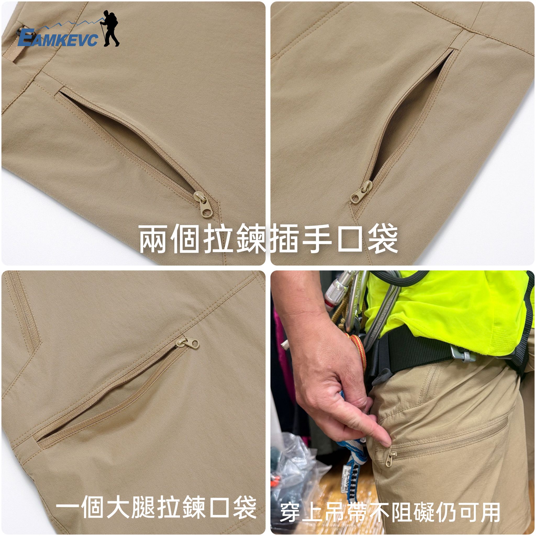 - 兩個拉鍊插手口袋及一個可兼容安全吊帶的大腿拉鍊口袋