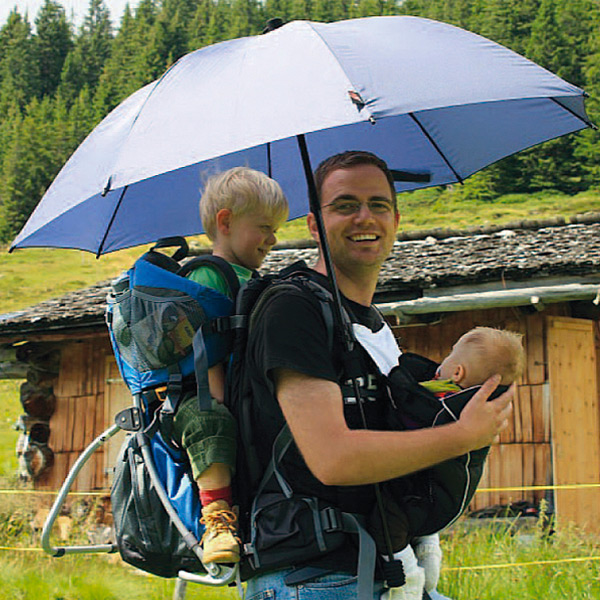 這把特別的雨傘強調它的伸縮玻璃纖維柄,可變化延伸到超過1公尺長度,利用一個小扭轉動作即可固定在任何高度。藉由兩個隨附的扣具去固定背包上的2個帶子,根據風和雨的方向可固定在右邊、左邊。雨傘握把的彈性環可彈性固定在腰帶上。