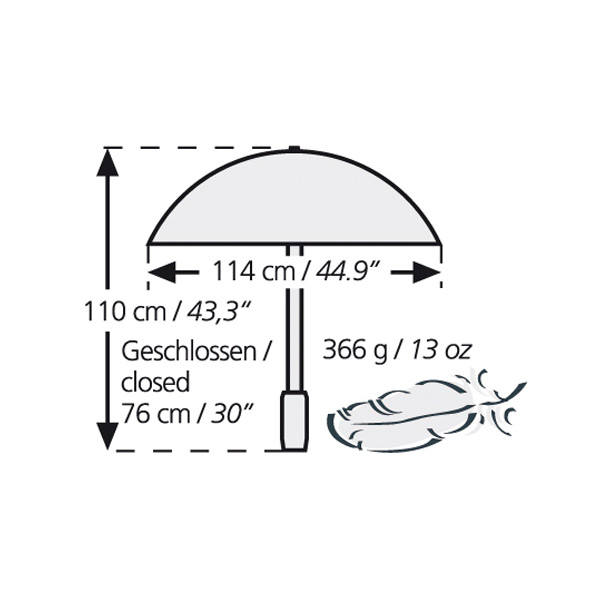 重量366克的雨傘亦可當一般的健行用雨傘使用,舒適柔軟光滑的握把,好觸摸且高密度的硬質泡綿提供最大可能的舒適握感。114公分直徑的傘面大得足夠在任何情況下確實保護健行者和背包。
