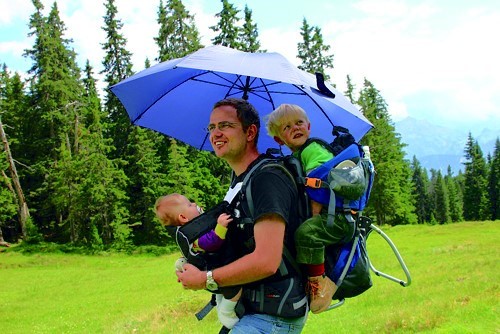使用腰帶,雨傘可輕易扣緊在任何標準背包上;或是可繫在EuroSCHIRM生產的架子-腰帶系統上。兩隻手可完全空出來,下雨天時可讓健行者拿登山杖、換鏡頭、使用GPS、查看地圖等。而且當嬰兒坐在爸媽背的背架裡或胸前時,不論是擋雨或遮陽都非常有用。