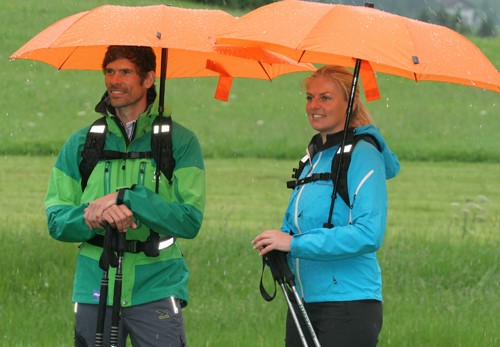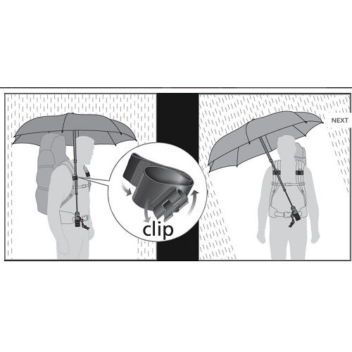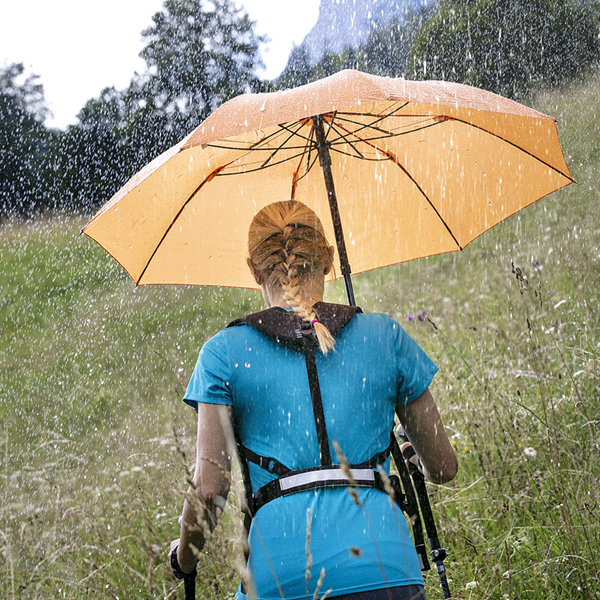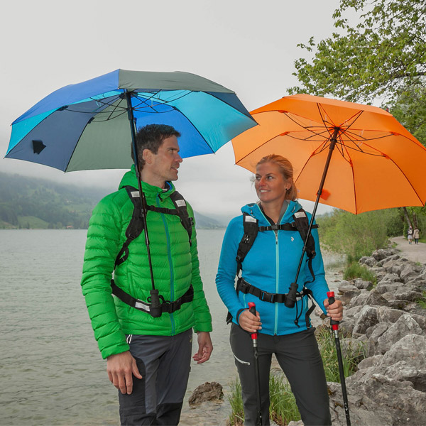 使用腰帶,雨傘可輕易扣緊在任何標準背包上;或是可繫在EuroSCHIRM生產的架子-腰帶系統上。兩隻手可完全空出來,下雨天時可讓健行者拿登山杖、換鏡頭、使用GPS、查看地圖等。而且當嬰兒坐在爸媽背的背架裡或胸前時,不論是擋雨或遮陽都非常有用。