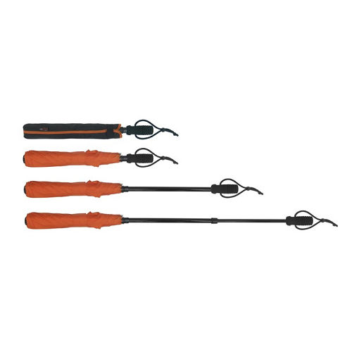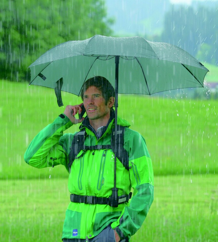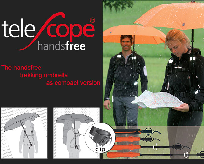 特色 : 「 免持傘 」 是那些需要在雨中自由活動者人的理想選擇:適合徒步旅行者使用登山杖以及林務員、園丁、賞鳥者或自然攝影師。特別亮點:玻璃纖維傘柱可伸縮至 96 公分,可扭轉固定在任何高度,以匹配主人的身高。 借助於兩個附帶的扣具,傘的握把可以固定在背包肩帶的左右邊,左、右或沿對角線固定到背包胸部的肩帶上,可定位在雨或太陽的方向。折疊在一起時,傘很短,很容易放入背包或包裡。另一個優點:免提口袋徒步旅行傘也可以像城市和日常生活中的普通傘一樣使用。