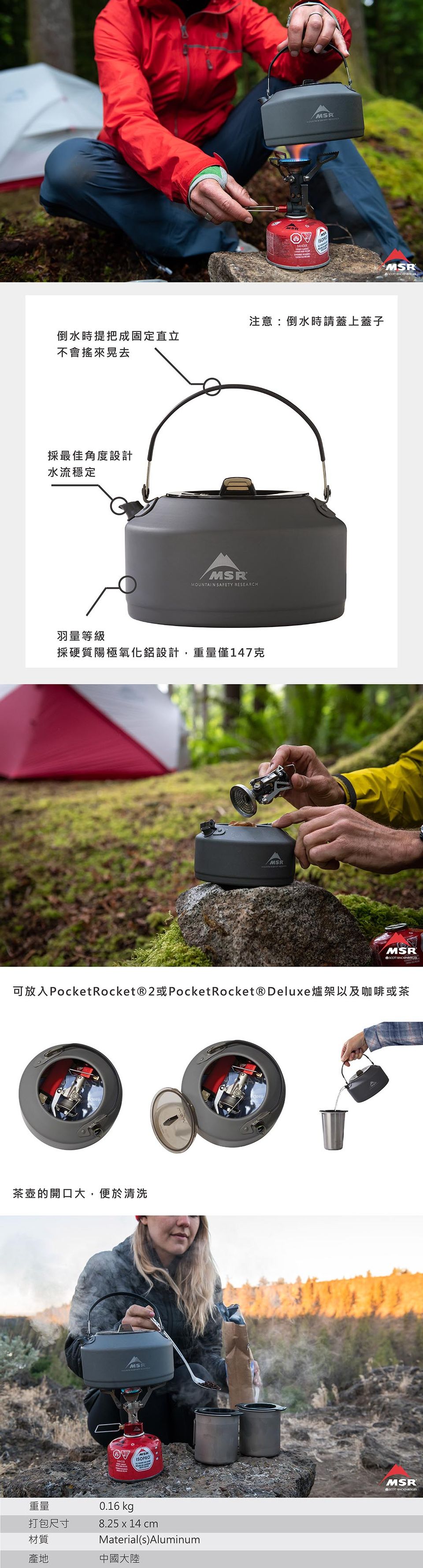 超輕鋁製茶壺的壺嘴採用最佳角度設計,水流穩定,且非常容易將您的咖啡或是茶倒入小口徑容器。 在您倒水時,提把保持直立,不易晃動易於操作且降低手部觸碰到壺身的機率。 茶壺的開口大,便於清洗,也可以讓您存放一個爐架和咖啡或是茶包。 對於那些超輕型旅行的玩家,茶壺是小鍋的絕佳替代品。