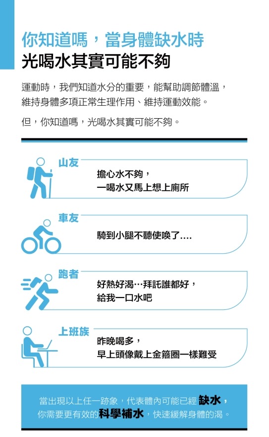 - 運動後 : 快速補充,緩解身體脫水狀態,增進代謝及恢復。
