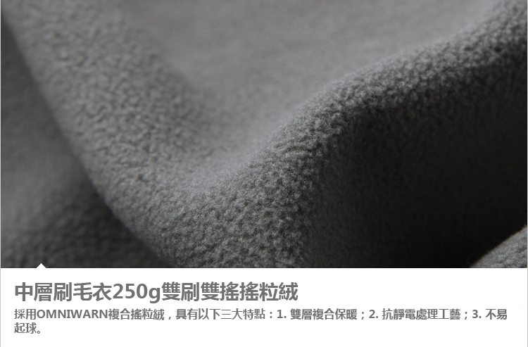 *中層刷毛衣,採用雙刷雙搖搖粒絨,恆溫系統,保暖度極佳