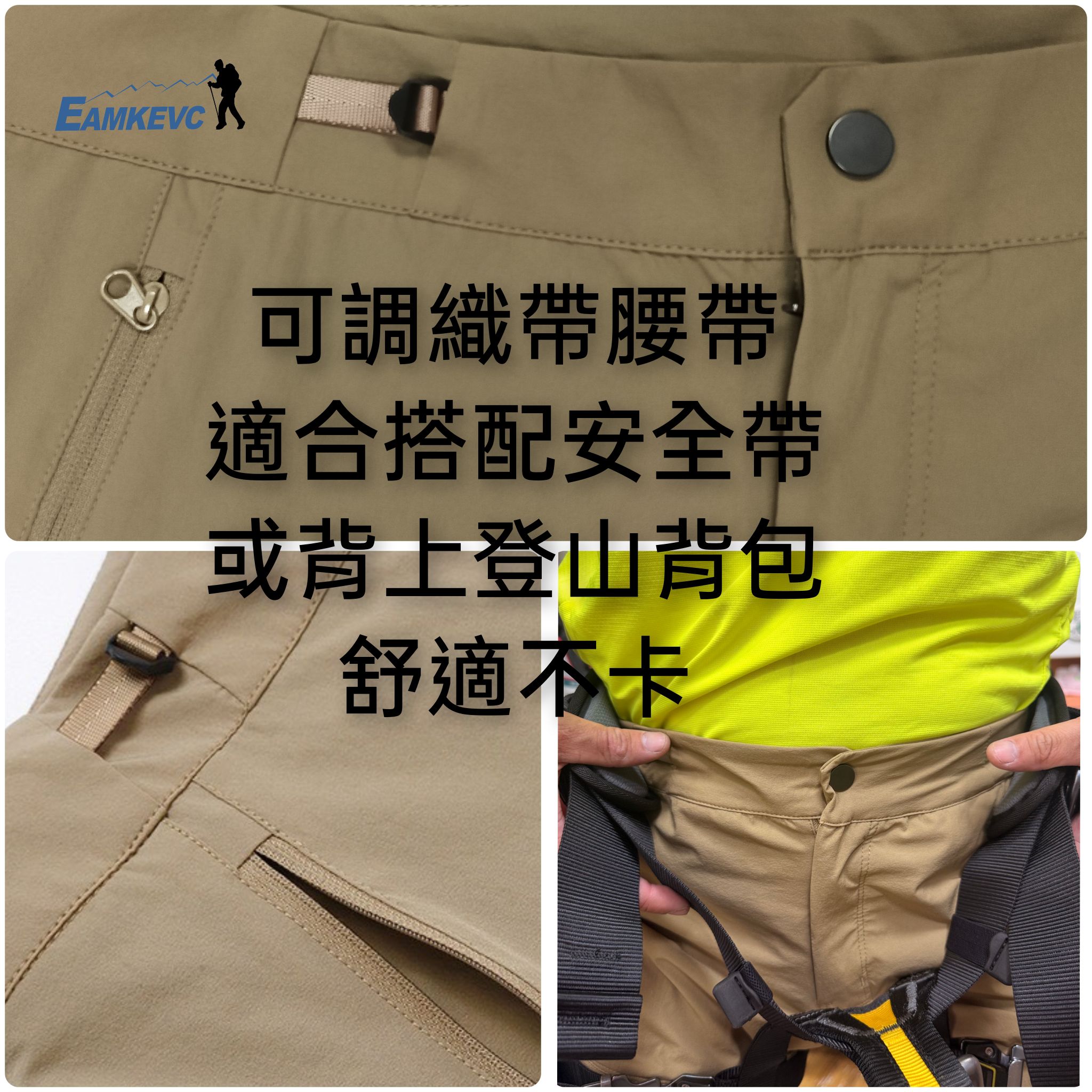 - 可調織帶腰帶,適合搭配安全吊帶或背上登山背包,舒適不卡