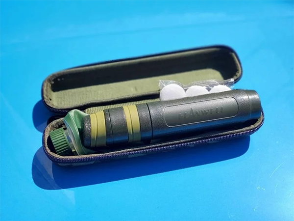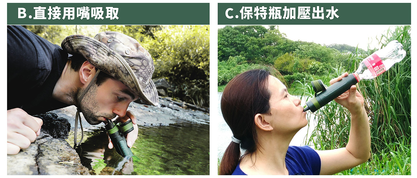 1.) 使用時用口吸取溪水透過戶外淨水器過濾後,可以直接生飲,或將濾水器旋轉接上裝了溪水的寶特瓶,擠壓過濾亦可直接生飲,濾心材料為美國奈米氧化鋁纖維層+日本炭纖維濾心,去除水中細菌病毒,濾心更換容易20秒可完成,SGS除菌報告99.9%。