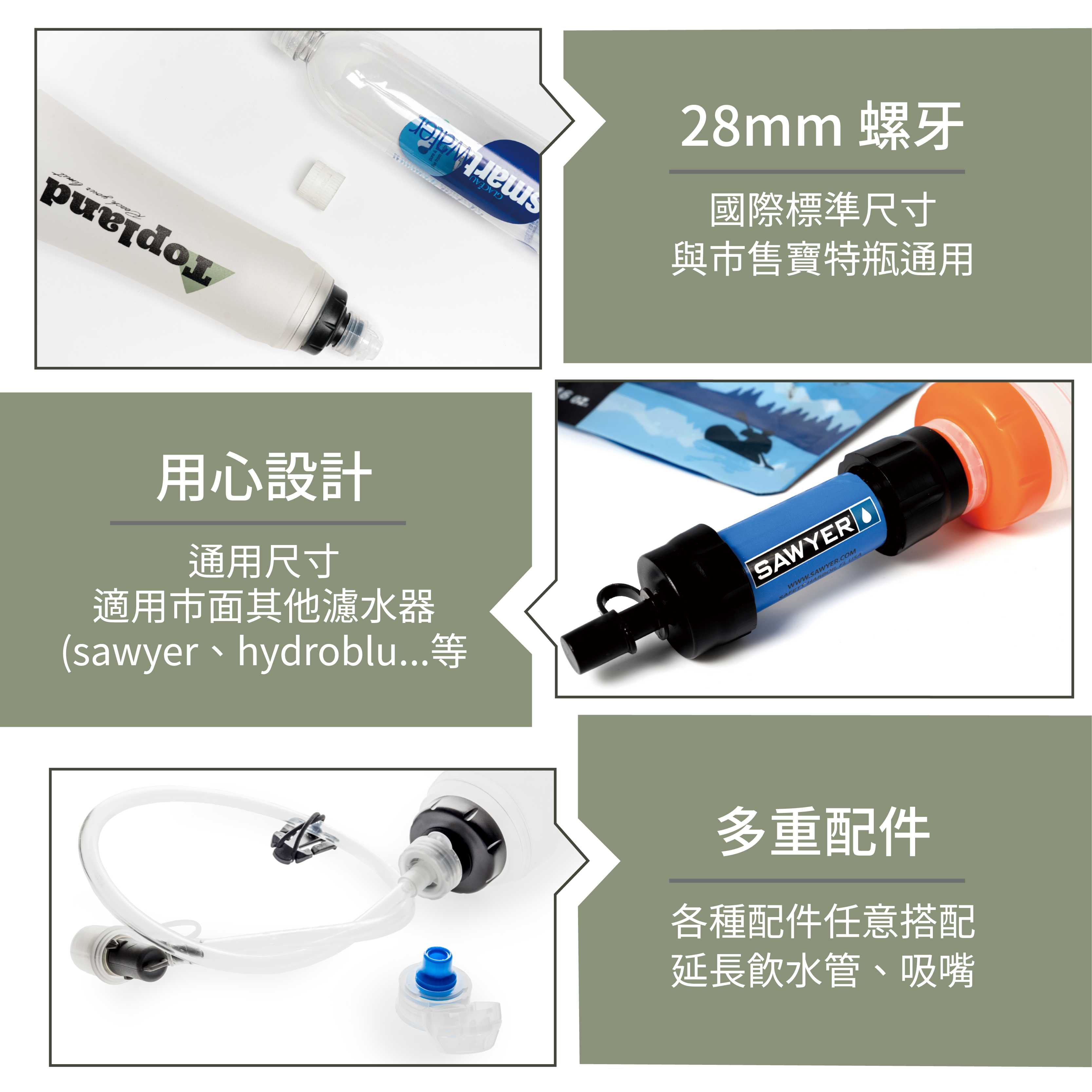 28mm 寶特瓶口規格,可搭配市面上其他廠牌的濾水器。