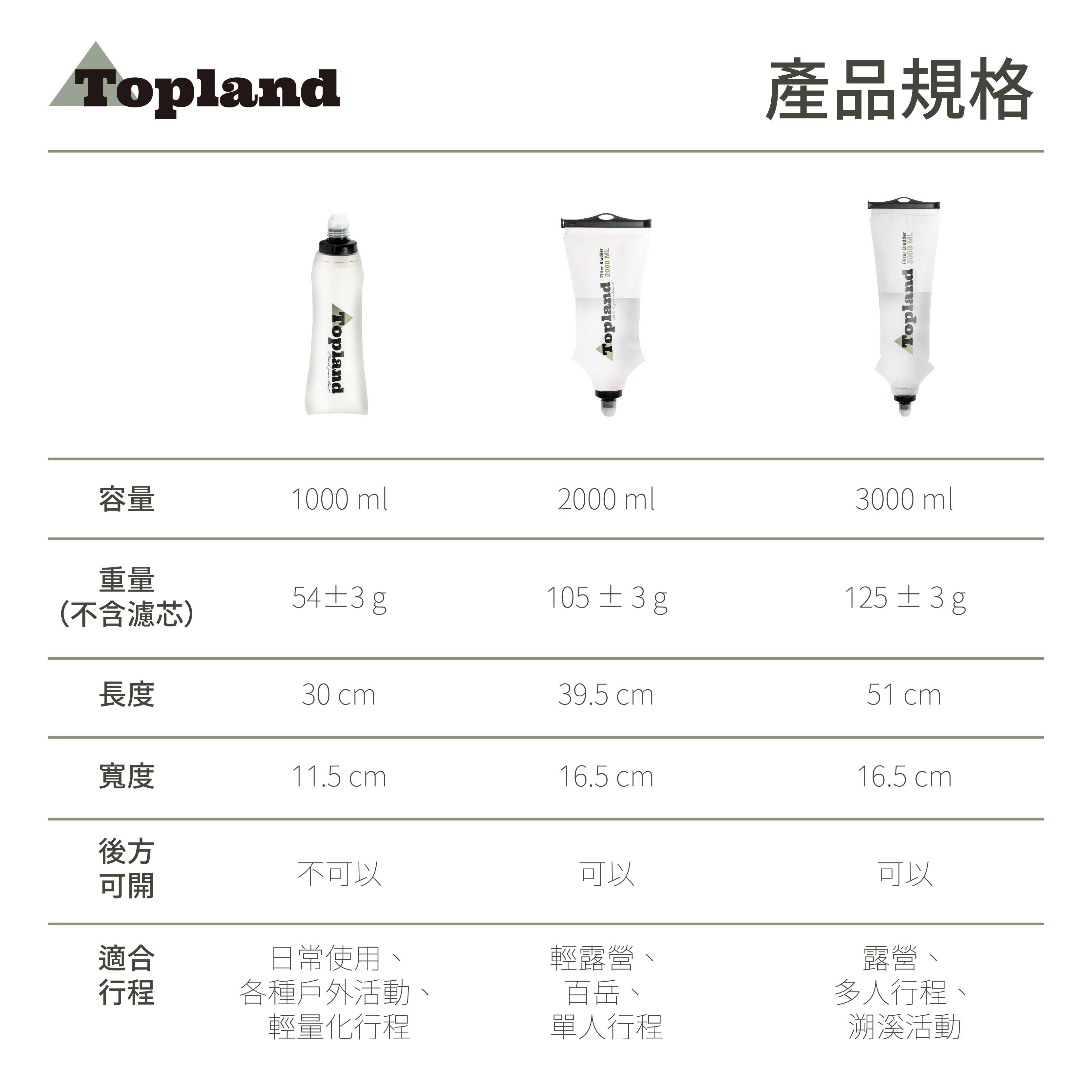 Topland Filter Bladder 是專門為台灣登山及露營環境設計的飲水過濾系統。輕量化與可摺疊的設計,方便使用者收納與攜帶。三階段不同層次的過濾,適用於溪流、湖泊、泉水,甚至是看天池等惡劣環境。優良的袋身開口設計,可用於各種水源環境。每分鐘兩公升以上的流速,節省飲水處理上的時間。Topland Filter Bladder提供台灣的使用者,在各種戶外活動中能輕鬆取得乾淨的飲水。
